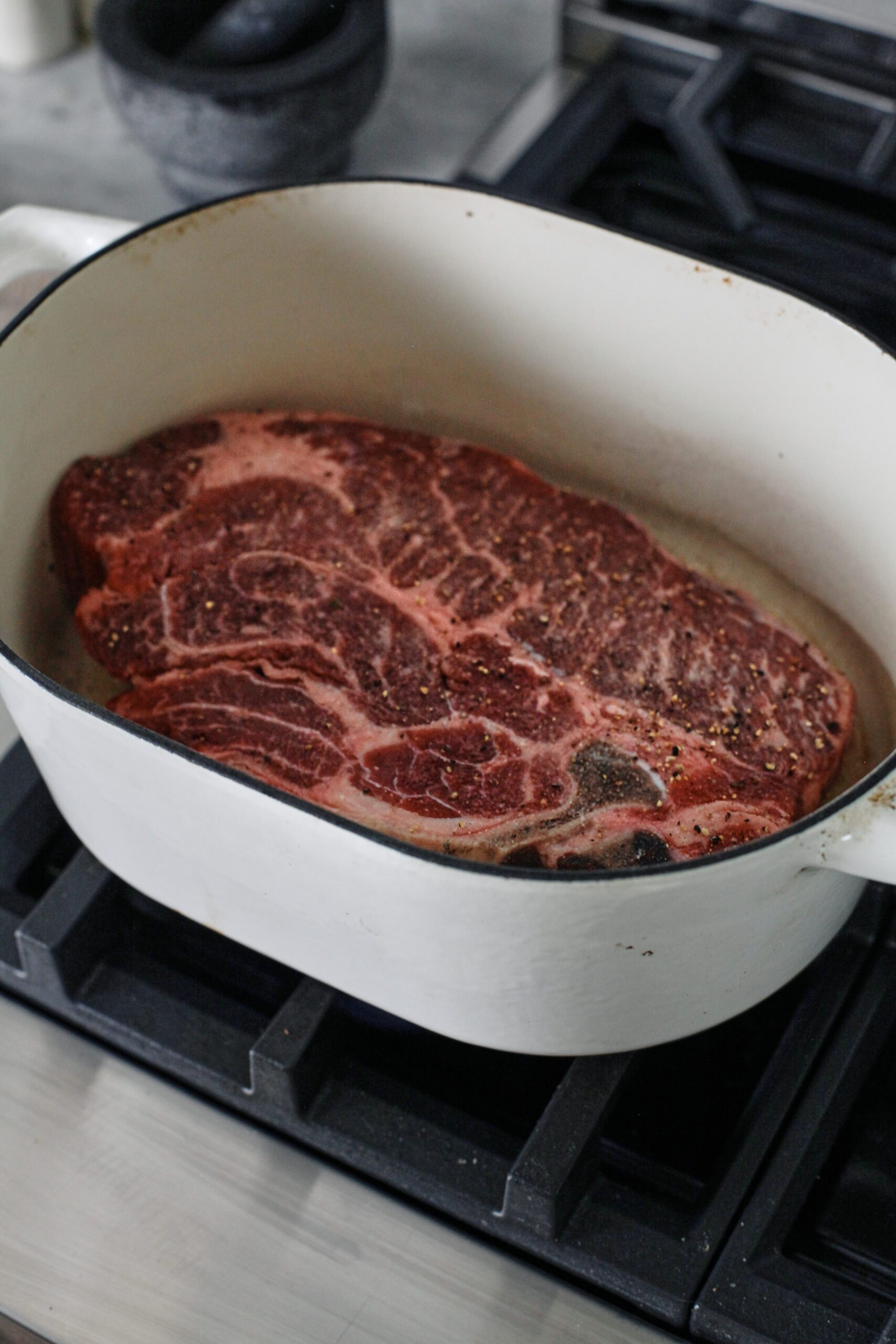 Braise in the oven for 2.5 to 3 hours, until beef is very tender. Option to add in baby potatoes and carrots into the dutch oven (if you have room) for the last hour. If not, you can boil, steam or roast those separately and serve together.