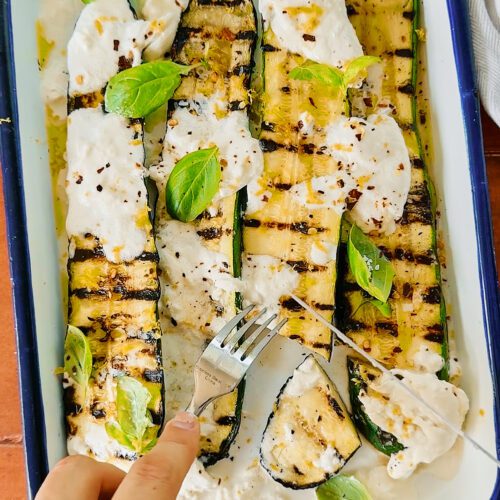 Grilled smoky zucchini, creamy burrata, the brightness of lemon juice and zest, the herby notes from the basil, and then an ever so slight kick with the red pepper flakes — you’ve got yourself a well balanced side dish here!
