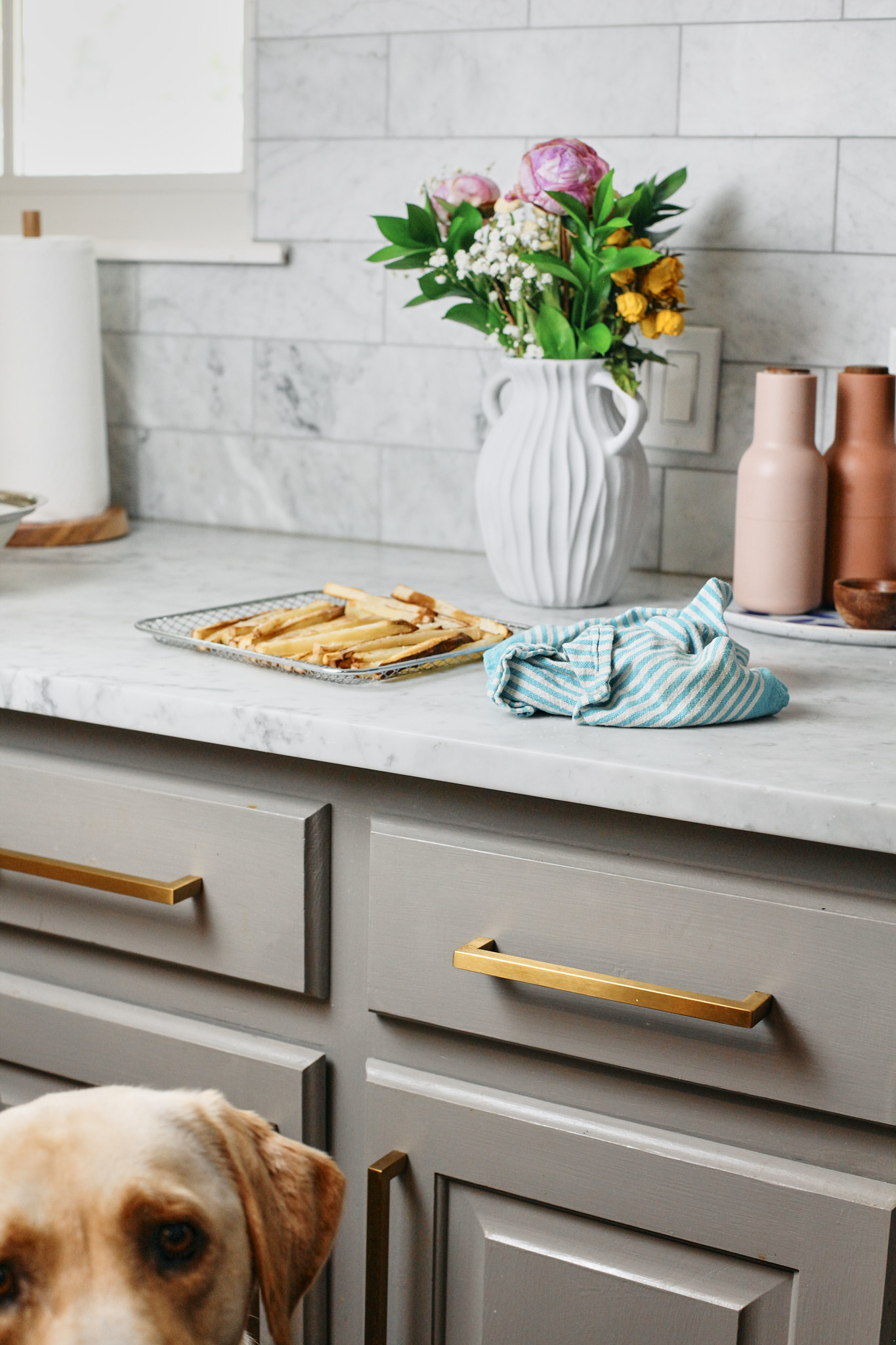 Cut the potato into uniform wedges or sticks so they cook evenly. We soak them in some cold water for at least 30 minutes to remove the excess starch, resulting in crispier fries. Pat dry them after and dress with olive oil and whatever seasoning you like. Air fry at 400 for 20-25 minutes (flipping half way through), or you could bake in the oven at 450 degrees for 20-25 minutes (flipping half way through). You could also fry these in oil that’s heated to 325 degrees for about 5 minutes, remove and bring the heat up to 375 degrees and fry them again until they’re golden brown and crispy!