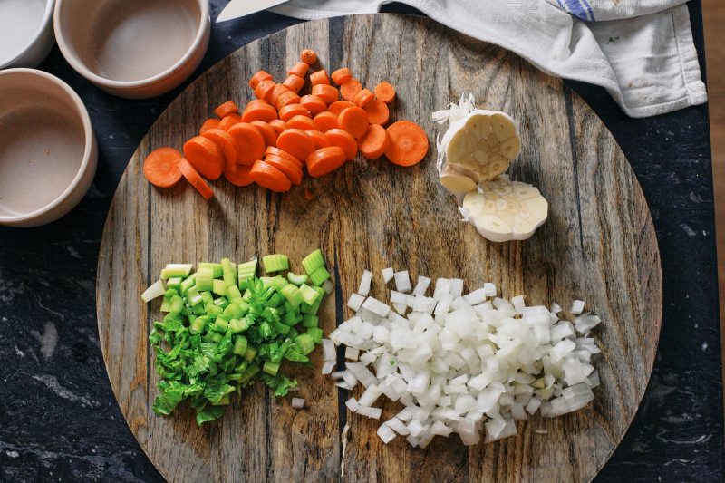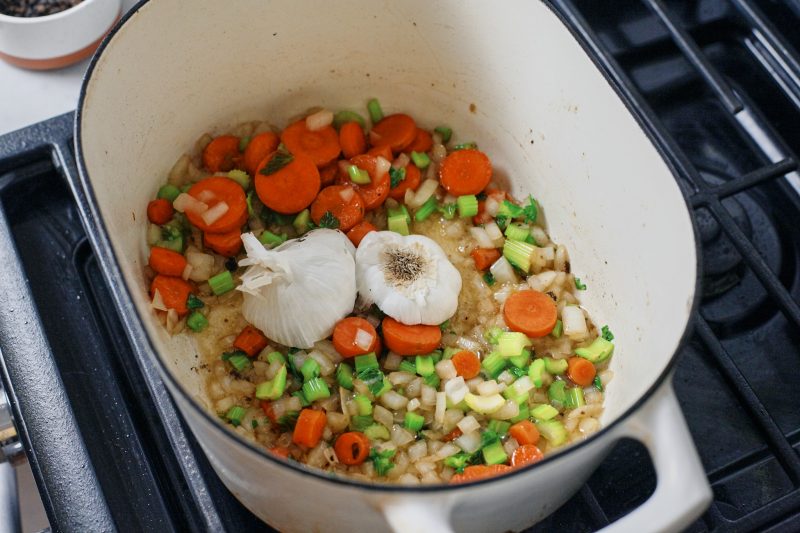 Our celery, onions, carrots and garlic get sautéed here for about 5 minutes until softened. We don’t want to brown these, just have them softened.