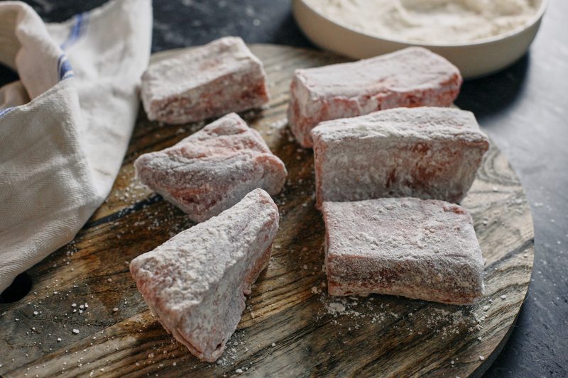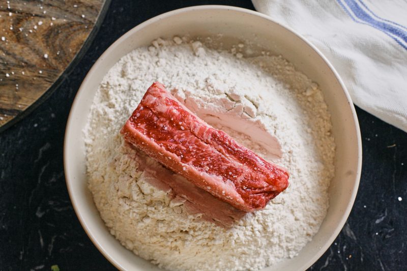 Take the beef short ribs out of the fridge 20-30 minute prior to cooking so you’ll get a more even cook. Pat dry them, and trim off any excess fat to your liking. Season generously with just salt. Next we dredge them in the flour and shake off the excess. The flour is going to help for a couple reasons: