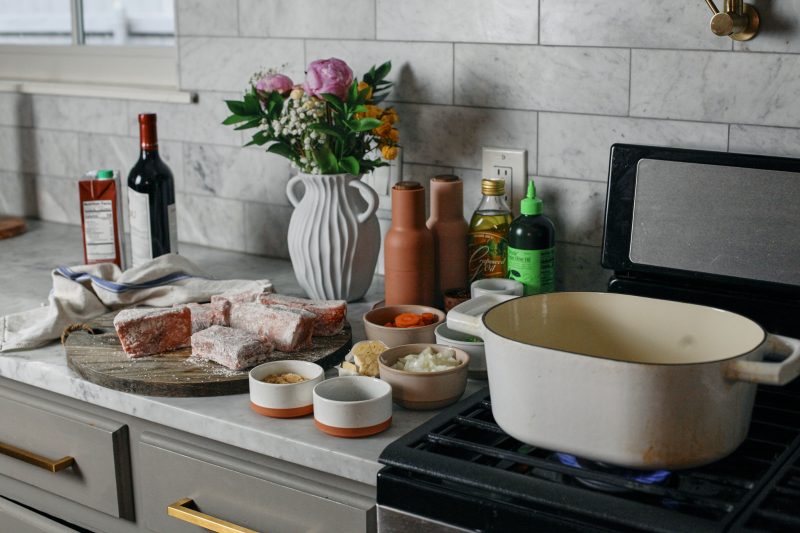Now that we have all of our prep ready, it’s go time. I recommend using a dutch oven for this so we can sear the meat and have it all go into the oven after.