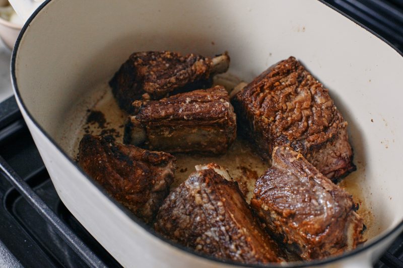 - Option to trim excess fat from the ribs. Season the short ribs with sea salt and then dredge in flour (on all sides). Shake off the excess and sear these for 2-3 minutes on each side in a dutch oven pot over medium heat with neutral oil.