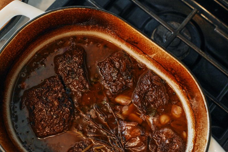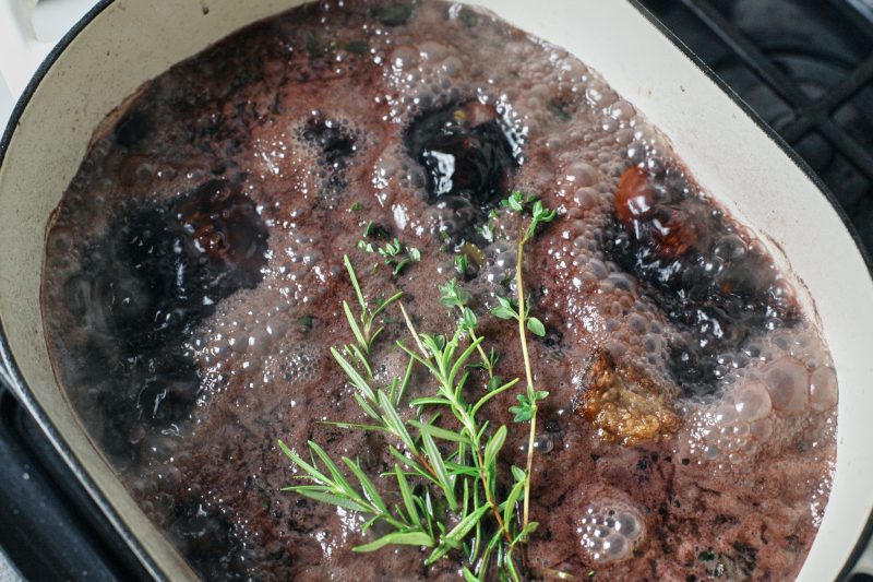 - Add in brown sugar, fresh herbs and black peppercorns. Bring this to a bubble, add the short ribs back in, cover and throw into the oven for 3 hours.