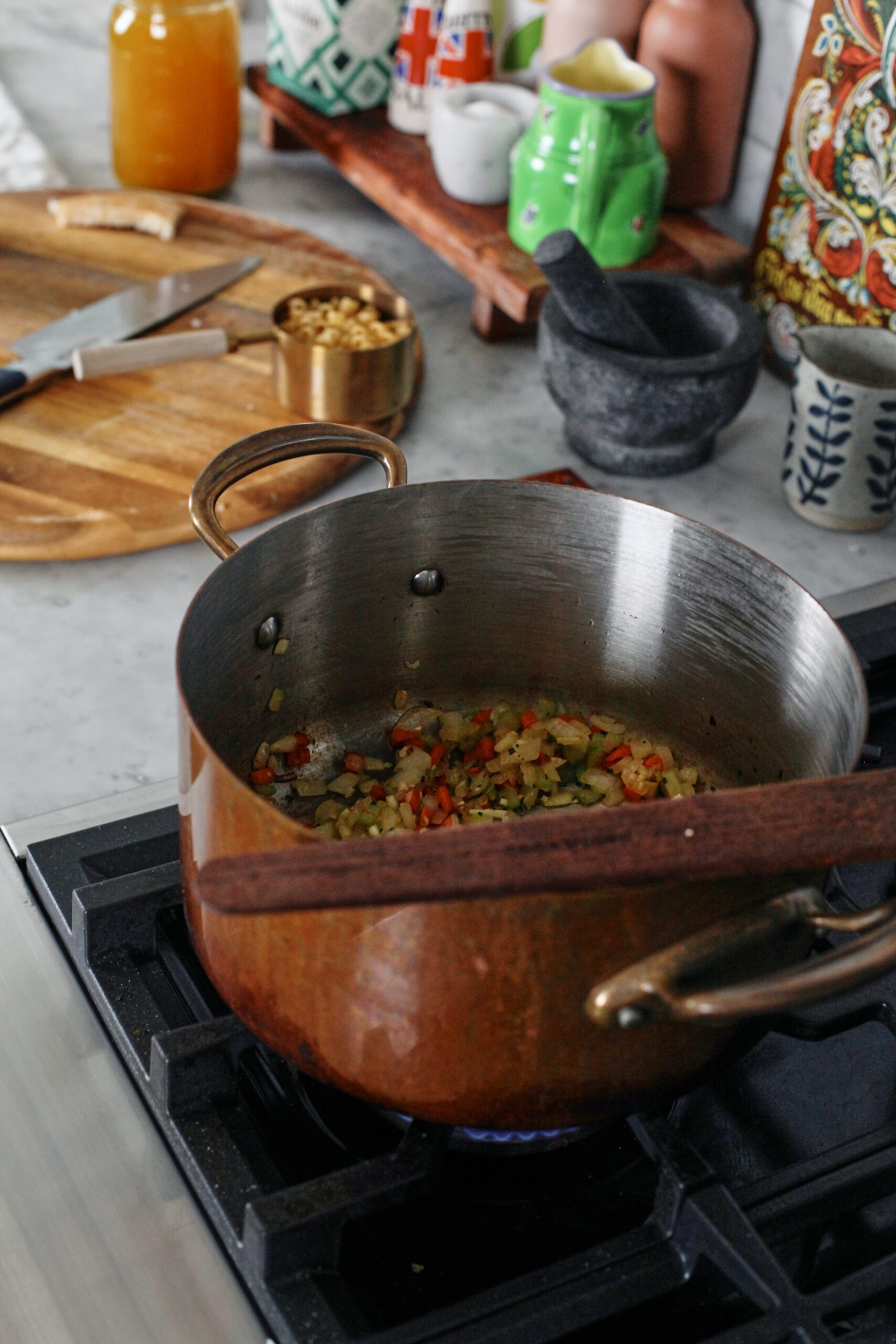 Note: for a slight creaminess to the soup, reserve about ¼ of the beans. After you add the broth in the next step, blend the reserved beans with 1-2 ladles of broth until smooth, then stir the mixture back into the pot.